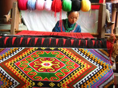 土家語中的“西蘭卡普”是一種土家織錦。“西蘭”是“被面”,“卡普”即“花”,“西蘭卡普”就是土家族的花鋪蓋,是土家姑娘的珍貴嫁妝。西蘭卡普多以絲、棉、麻為原料,一般以紅、藍(lán)、青三種顏色為經(jīng)線,緯線可以自由選擇顏色。用古式織機(jī)、挑花刀采取通經(jīng)斷緯、反面挑織的方法手工挑織而成。西蘭卡普構(gòu)圖大方,織工精巧,花樣豐富,色彩鮮明熱烈而古樸,被稱為土家文化的活化石。