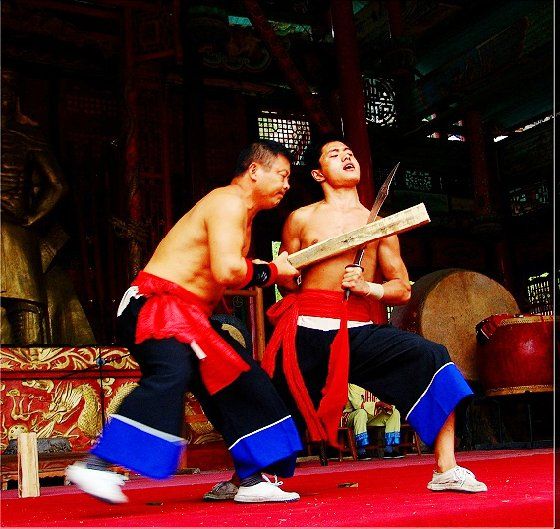 大庸氣功 大庸氣,堪稱武林奇葩,曾為祖國贏得聲譽,海內(nèi)外享有極主名望。 大庸氣功是大庸各民族特別是土家族傳統(tǒng)體育項 目之了,分健體氣派、武術(shù)氣功兩類。前者有“返還 功”、“馬王推氣功”、“少林達摩醫(yī)療保健氣功” 等;后者有靜坐、壁虎、靈子、二指彈、碎石、松靜 、硬氣、五禽、五陽功等,尤以硬氣功著稱。大庸硬 氣功,歷史悠久,漢代相單程,明代覃后,清代劉明 燈,當(dāng)代湯子模、周鐵鞭、杜心武、趙繼書等都具有 超人硬氣武功。大庸土著民族在漫長的反征服、反壓 迫斗爭,博采武當(dāng)、少林南北派、昆侖派眾家武林精 華,創(chuàng)造出獨此一家的大庸硬氣功。 據(jù)傳,大庸硬氣功鼻祖是楚國鬼谷子?!?a class="insidelink" href="http://m.powuer.com/cityinfo/15580531721.html" title="永定區(qū)">永定縣 志》有關(guān)鬼谷子隱居天門山鬼谷洞潛心學(xué)《易》、傳 授方術(shù)的記載。到清代有武林高手朱茂嶺,隱居三岔 村北芭蕉灣洞,研究鬼谷氣功之術(shù),后收西溪坪胡口 子、余世萬(即“余通人”)為徙,傳其衣缽。余通 人將武術(shù)氣功系統(tǒng)整理,發(fā)揚光大,播名于世。 新中國成立后,黨和政府十分重視民間氣功發(fā)掘 整理,并正式列為體育項目加以普及發(fā)展,今日大庸 市習(xí)練硬氣功達數(shù)萬人眾。永定區(qū)官黎坪村世有“硬 氣功之鄉(xiāng)”盛譽,該村男女老幼,練功已蔚成風(fēng)氣, 其武師趙繼書,1979年先后參加全省和全國武術(shù)大賽 ,均獲一等獎,受到國家體委重視,同年7 月趙繼書 專程到北京給中央領(lǐng)導(dǎo)同志匯報表演。嗣后,隨同中 國武術(shù)代表團和國家領(lǐng)導(dǎo)人先后兩次出國,到盧森堡 、意大利、比利時、羅馬尼亞、馬其他和東南亞等國 家訪問。他表演的臥刀碎石、頭頂開石、雙鳳灌耳、 頭碰石柱、叉尖推磨等精彩節(jié)目,博得外國友人好評 。盧森堡一位榮獲國家獎牌的武士,看了表演后連夜 來到中國大使館,將自己珍藏多年的獎牌贈送給他; 盧森堡國王主動熱情走上臺與趙繼書熱情擁抱,連連 稱贊:“了不起!了不起!國際氣功大師!”并把珍 藏紀(jì)念章一枚贈送給趙繼書。一位法國朋友十分贊賞 說:“中國的氣功,稱為全人類的寶貴財富,是有科 學(xué)道理的。”自此,大庸硬氣功譽滿全球。湖南瀟湘 電影制片廠專門拍攝了彩色紀(jì)錄片《大庸氣功》。 大庸硬氣功共有二十多個項目,最有影響的是: 腹臥鋼叉 由二人在地面扶住一根叉尖朝上的三 股鋼叉,叉尖猁鋒利,然后一個俯身叉尖,尖抵腹部 ,待其四肢平展懸空,扶叉二人轉(zhuǎn)動鋼叉,謂之推磨 。表演時,要求臥叉者運氣于腹,氣意集中,稍有大 意,叉即穿腹而過。 臥刀破石 先固定兩把大刀,刀口朝上,臥刀者 運氣后,由其他人抬臥于刀口上(有仰臥、俯臥兩種) ,然后在臥刀者腹部或背部置一碩大石條(約數(shù)百斤) ,一人或兩人輪大鐵錘狠擊石條直至斷裂破碎為止。 釘?shù)洞财剖?地上倒一層碎玻璃片,一人仰臥其 上;然后腹上置釘床,又一人仰臥釘床上,再于第二 人腹上置釘床,第三人仰臥刀床上,腹部上壓一塊數(shù) 百斤大條石,由人掄錘狠砸,至石破為止。 銀槍刺喉 用一根兩頭安有鋒利槍頭的鋼槍,抵 置兩位表演者喉部,然后相對發(fā)力,至槍桿抵成彎弓 形而喉部安然無恙。 徙手?jǐn)嗍?表演者將堅滑如鐵一塊卵石置于石凳 (地)上,然后運氣于掌或指擊斷(碎)卵石。 踢腿斬石 表演者運氣于腿,以腿踢斷石條。一 般可踢斷15公分以上厚度的麻石條或青石條。 胸部打刀 將鋒利大刀刃口置于胸部肌肉上,用 一根拳頭粗木棒猛擊刀背,至棒斷而胸部無傷。 新中國成立以來,大庸民間武術(shù)與民族體育逐漸 融為一體,發(fā)揮著提高人民身體素質(zhì)、弘揚中華武術(shù) 傳統(tǒng)和增進國際友誼重大作用。除硬氣功外,還有數(shù) 十種武術(shù)形式散見于民間武術(shù)體育活動之中。如打飛 棒、扭扁擔(dān)、抵搭斗杠、擠油渣、甩抱腰、舉石鎖、 板牛角(一種斗牛形式)等等。其特點是因地制宜, 不分場地,凡田園地角院壩集鎮(zhèn),都是習(xí)武練功、開 展活動的處所,頗具泥土氣息。擬或以生活中某些動 作和動物的某種形態(tài),稍加模仿演繹,便成某一獨特 武術(shù)形式。如天門武術(shù)功夫大師余道人所創(chuàng)造的“宮 天梳”、“巖燕樸天門”等;也有就地理特點創(chuàng)造某 種武功形式的,如“蕩藤”等。 以上部分圖片均來自互聯(lián)網(wǎng),出處不詳,請作者與本站聯(lián)系。 |