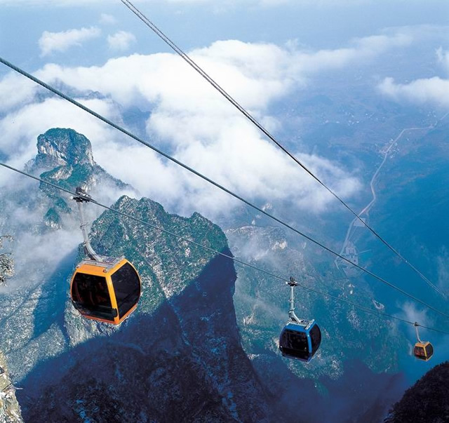 ②、張家界天門山索道為全世界最長的觀光客運(yùn)索道,索道線路斜長7455 米,索道運(yùn)行速度為每秒 6 米,單程運(yùn)行時間約28分鐘。上、下站水平高差1279米主要設(shè)備均由法國POMA公司原裝進(jìn)口,索道鋼繩來自于法國, 98 個吊廂來自瑞士 CWA 公司,單個造價(jià)高達(dá) 20 萬元人民幣。有嚴(yán)重心臟病或恐高癥等患者不建議乘坐;