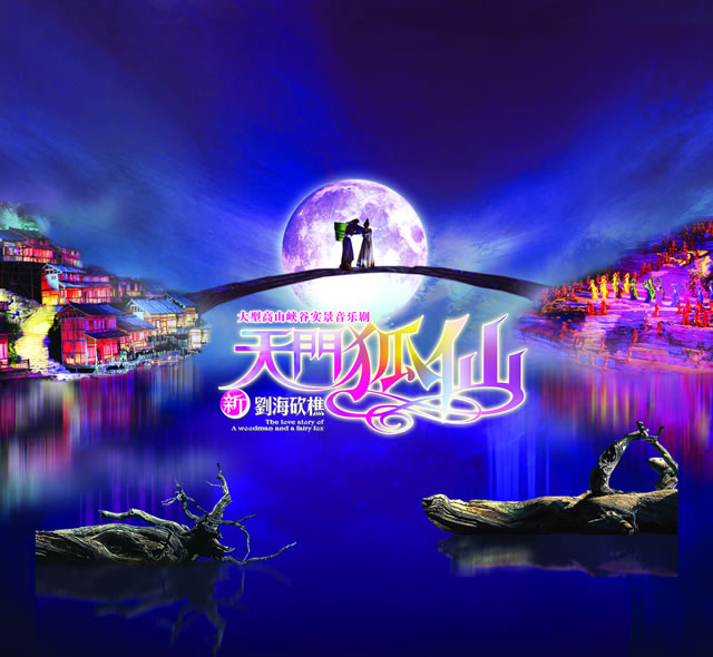 《天門狐仙——新劉海砍樵》目前是世界第一臺有完整故事情節(jié)的山水實(shí)景音樂歌舞劇。舞臺選址在天門山風(fēng)景區(qū)山門口內(nèi)至天門山頂?shù)恼麠l峽谷,總投資達(dá)到1.2億元,演員隊(duì)伍達(dá)530多人。主舞臺以10000平米的玻璃鋼打造,是目前世界最大的全景玻璃鋼舞臺。音樂主創(chuàng):譚盾。