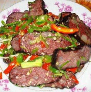 名稱: 血豆腐 介紹: 血豆腐,就是將豆腐和豬血、豬肉及花椒、辣椒等佐料拌成泥狀,捋成卵形,以竹篩置火炕上,煙熏烤成臘黃,吃起來耐嚼味香,是土家特色菜,當(dāng)?shù)厝顺R云湎戮啤?在張家界的飯館里很難吃到正宗的土家特色菜,可以去做土味的特色餐館去解解饞。但是最正宗還是鄉(xiāng)下人家家里自己熏的,那才叫一個(gè)好吃?。。?/p>