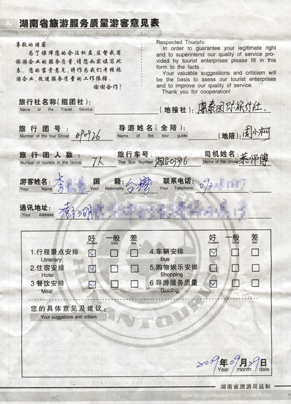 9月26日臺(tái)灣李先生一行7人接待質(zhì)量反饋單: