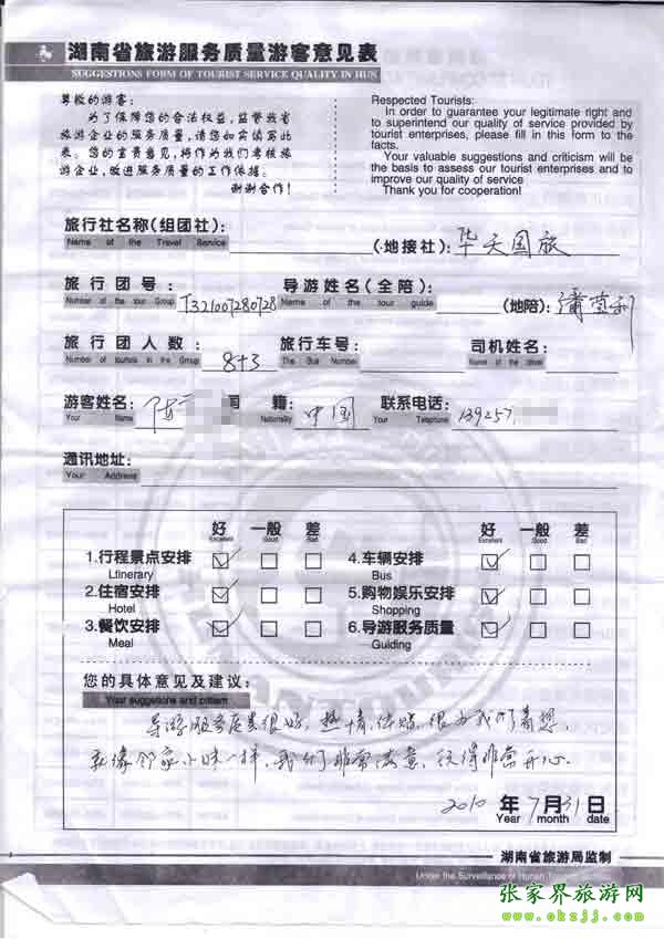 2010年7月31日陳先生一行8位旅游質(zhì)量反饋