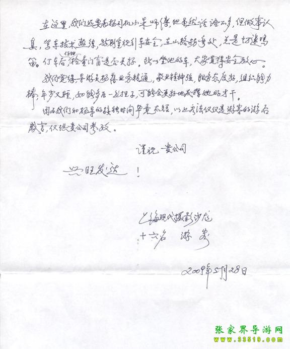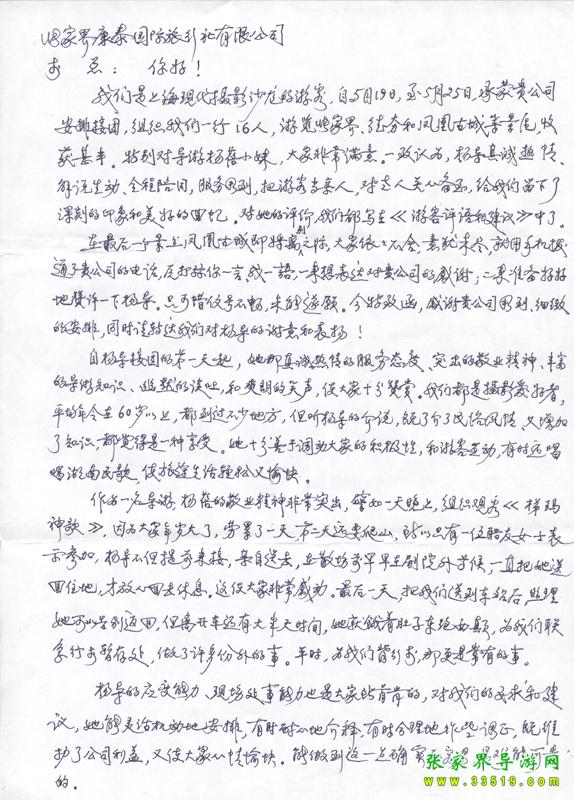 2009年5月19日“上?,F(xiàn)代攝影沙龍”一行16人,參加張家界旅游導(dǎo)游網(wǎng)組織的張家界旅游跟團(tuán),于2009年5月25日結(jié)束行程。游玩期間,由于導(dǎo)游楊蓓的出色講解和周到的服務(wù),得到客人的一致好評(píng)??腿颂丶谋頁P(yáng)信一封,如下: