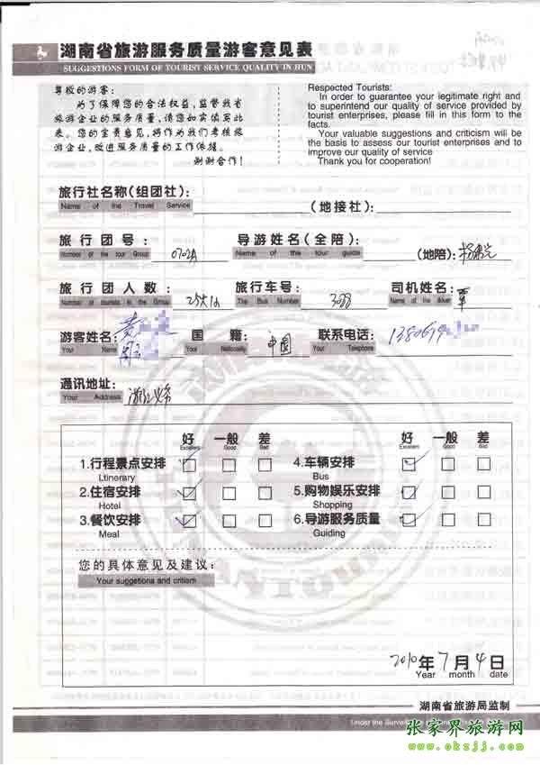 2010年7月4日浙江黃先生一行兩位旅游質(zhì)量反饋