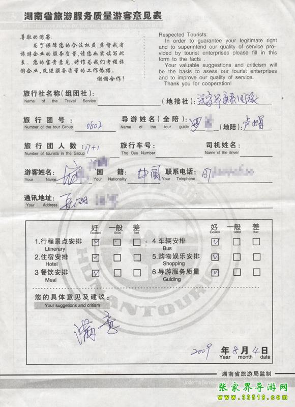 2009年8月2日岳陽龍先生一行18人接待質量反饋單: