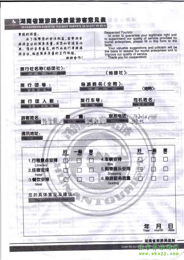 2010年10月23日陳小姐旅游質(zhì)量反饋